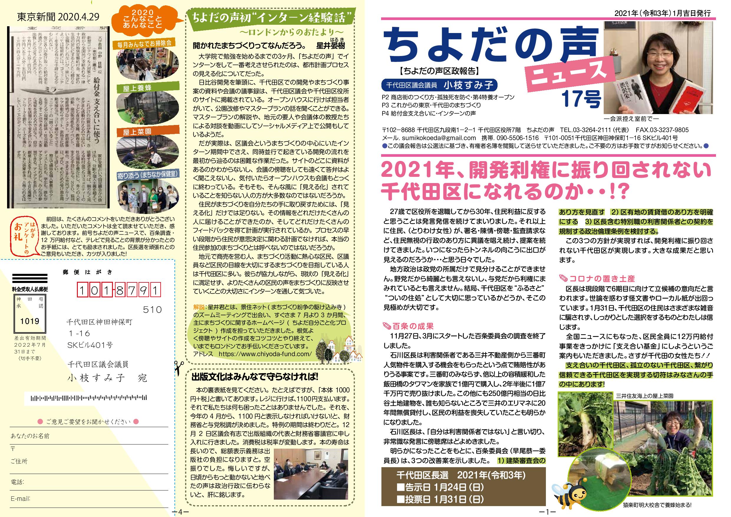 千代田区 ちよだの声ニュース第17号 発行しました!(2021年1月発行) 2021年1月15日 すみ子 画像をクリックすると大きな画像でご覧いただけます。紙でご覧になりたい方はお気軽に小枝までお声がけください!